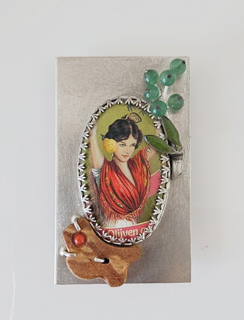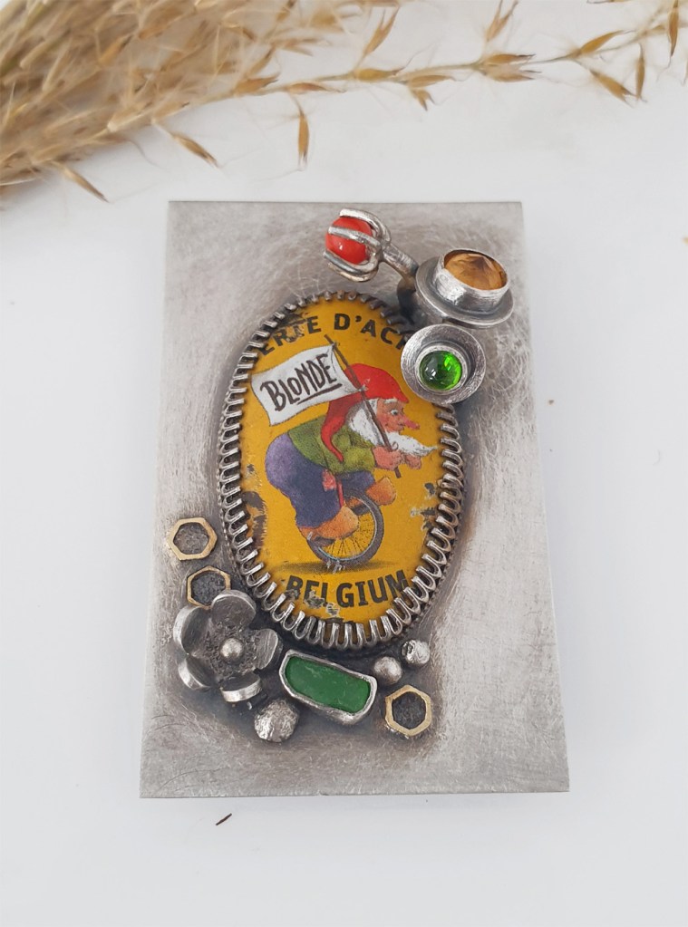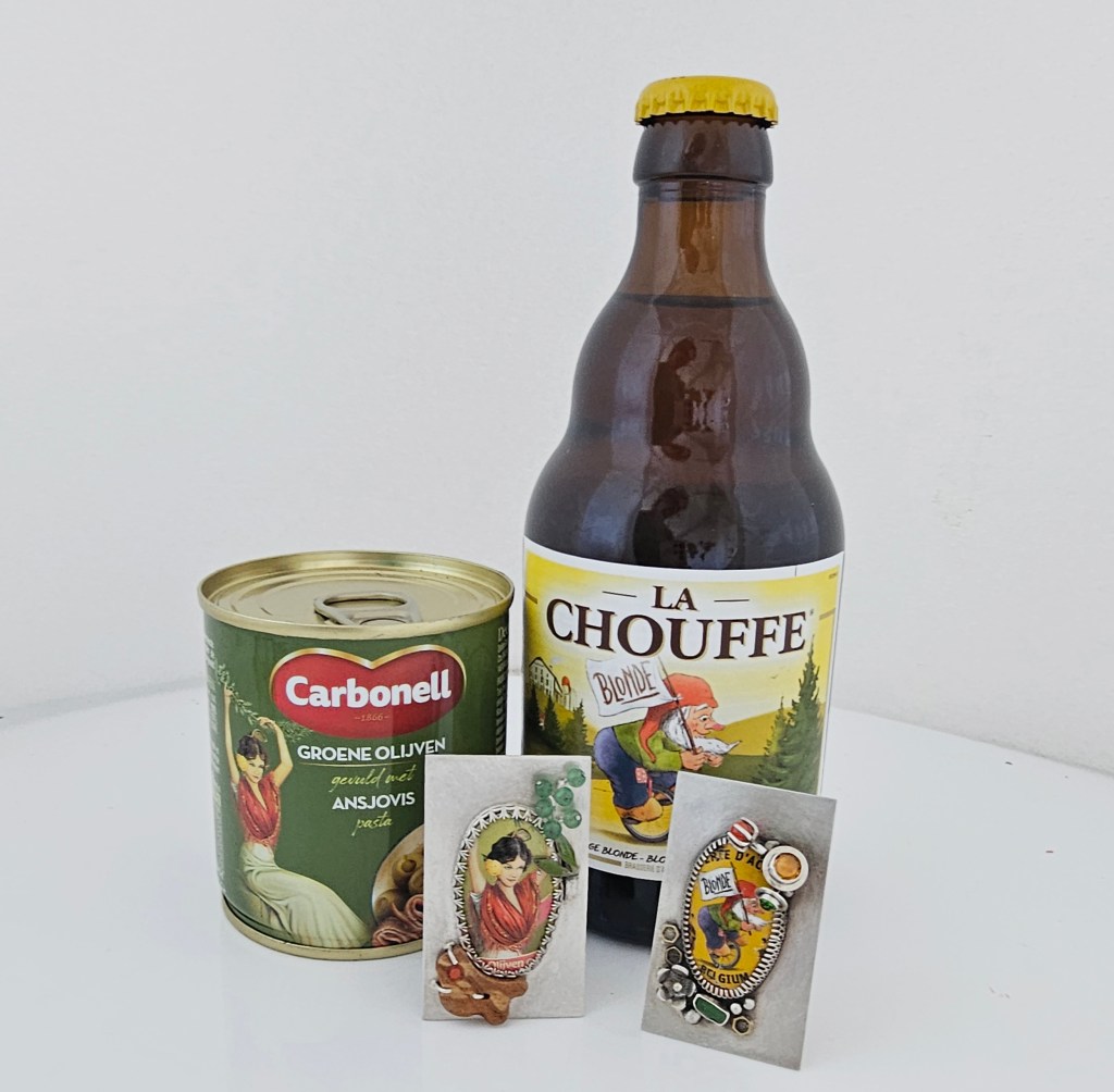 I’ve always wanted to use the Corbonell olive tin girl in a design and this was the ideal opportunity to do just that. And also pair it with a beerbottle cap brooch I have made a while ago.