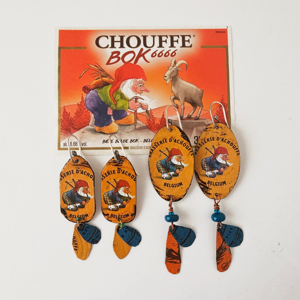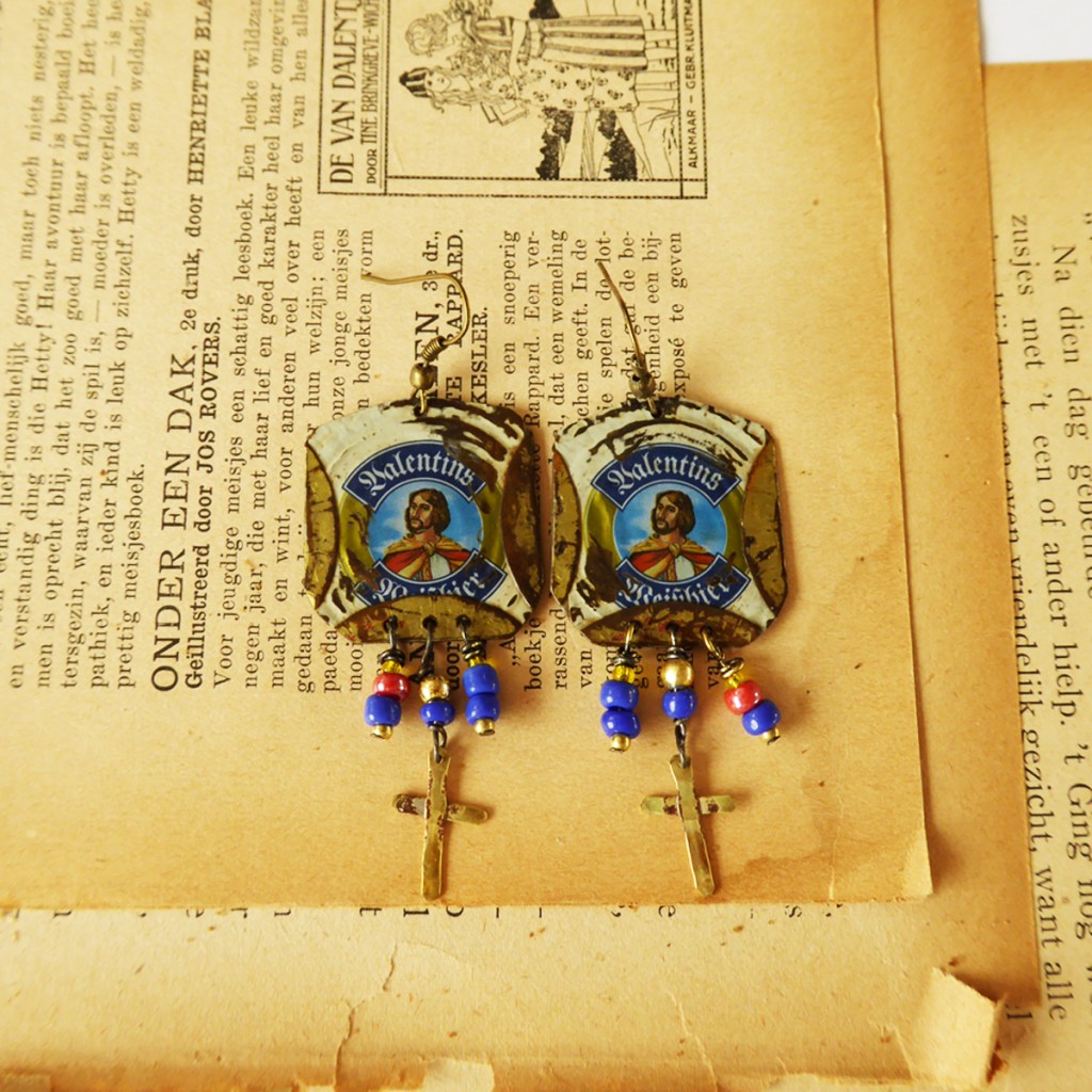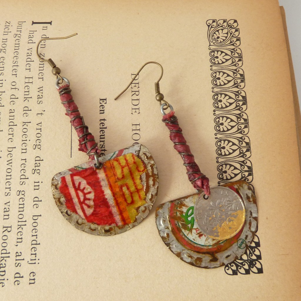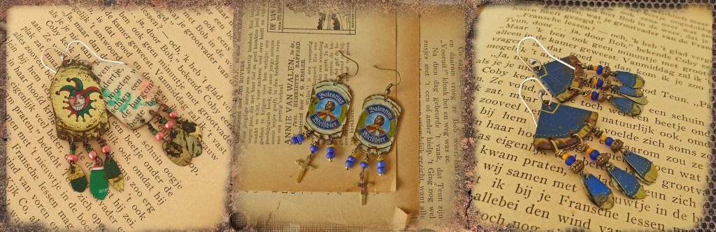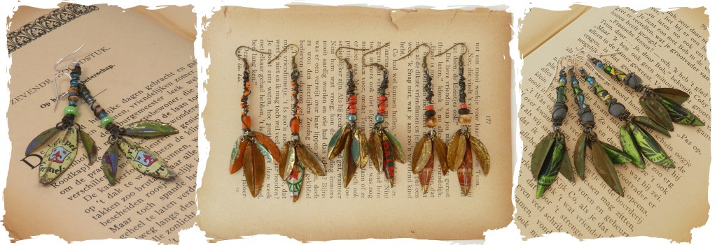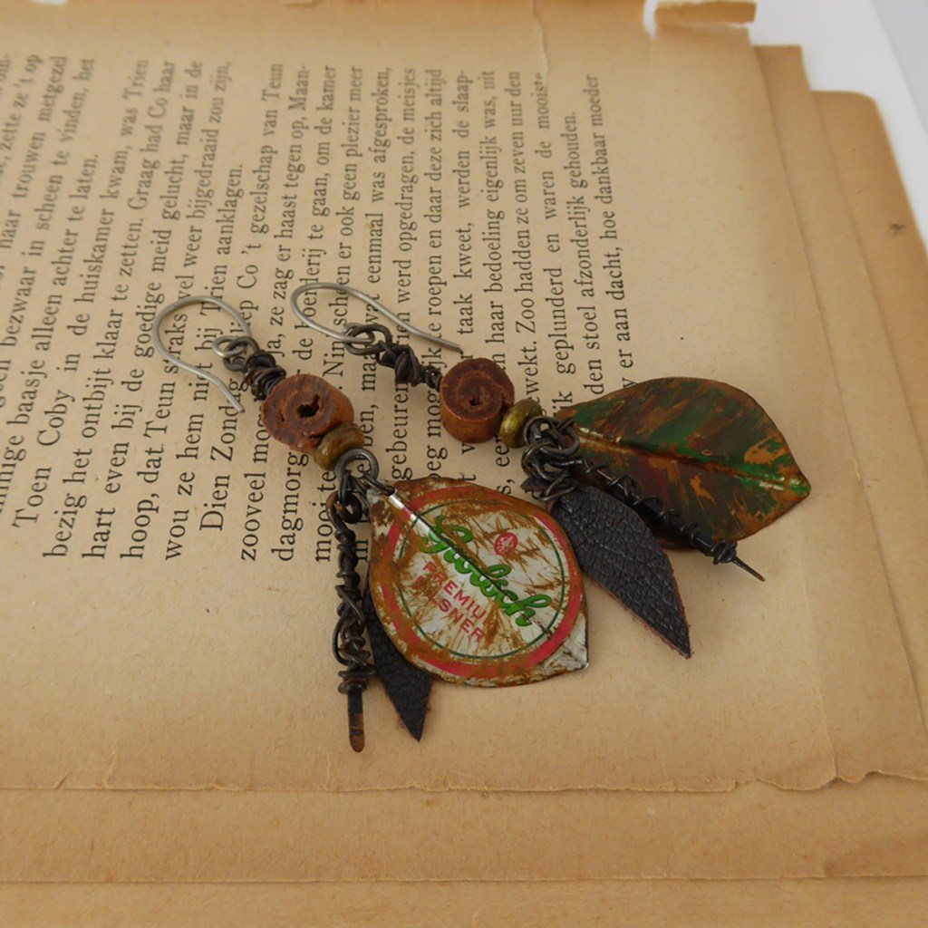 Also great fun to make these leave designs earrings. For the ones below I have used the caps of Karmeliet, Heineken, Palm, Grolsh and the Desperados ginger flavour beers. For each earring the 3 leaves are cut out of one flattened beer bottle cap.