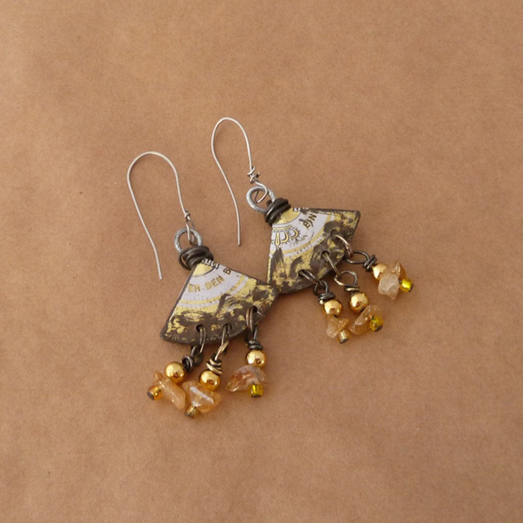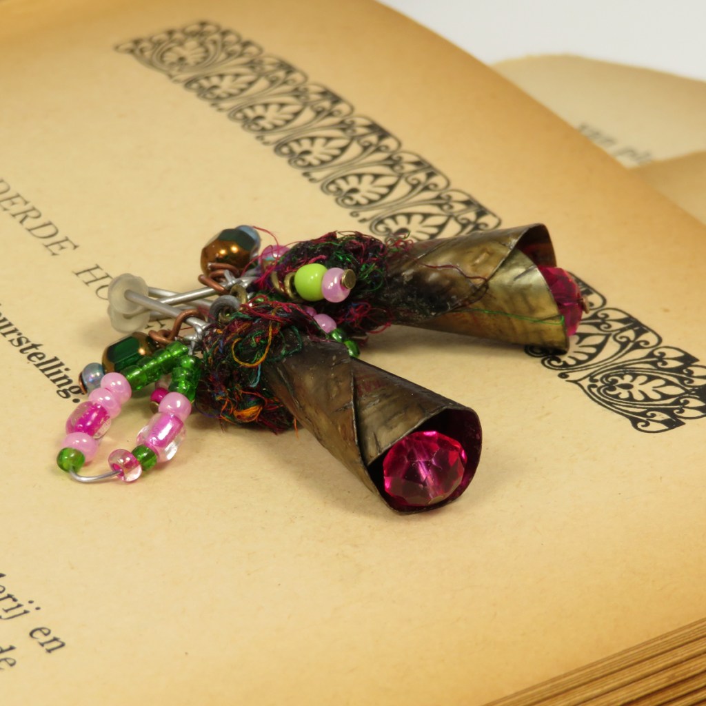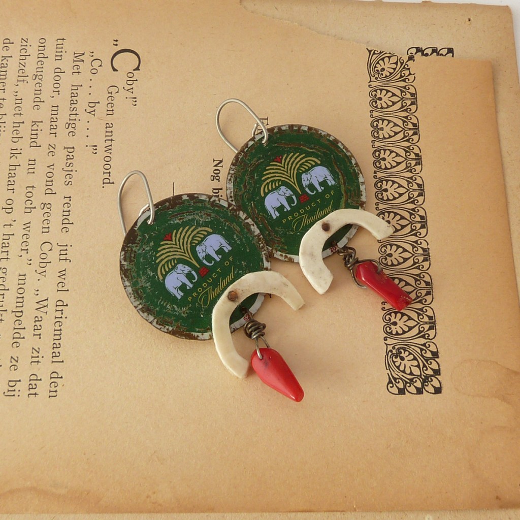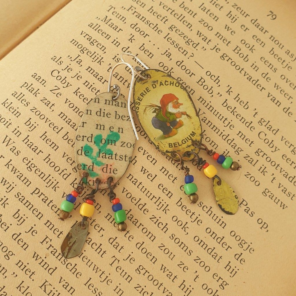 Also great fun to make these leave designs earrings. For the ones below I have used the caps of Karmeliet, Heineken, Palm, Grolsh and the Desperados ginger flavour beers. For each earring the 3 leaves are cut out of one flattened beer bottle cap.